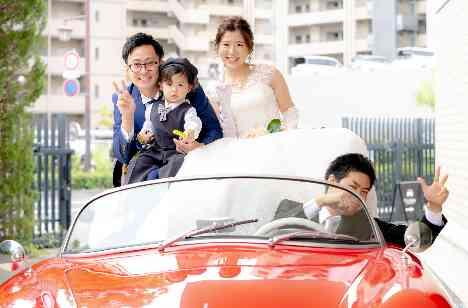 ご披露宴は真っ赤なオープンカーでご入場!今度はパパとママと一緒に車に乗れました♪ほっと安心した表情が伺えます^^オープンカーの運転は記念にと、ご兄弟にお願いしました!みんな笑顔でハイチーズ☆
