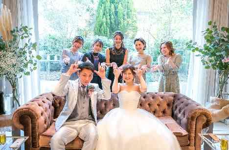 ゲストとの距離を近く感じられるソファ席でご用意♪ゲストの皆様とたくさんお写真を撮影しました!ソファ席ならではの、新郎新婦様とソファに一緒に座って撮影も可能です☆お花もこだわりのくすみ系で合わせました♡