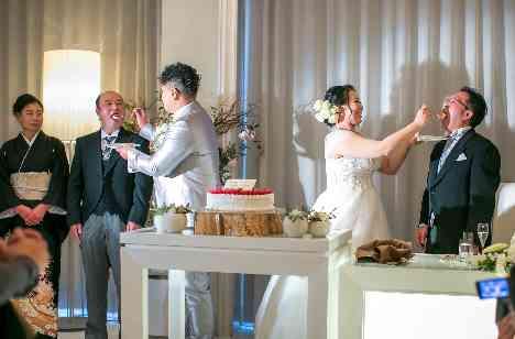 お父様お母様に今まで大切に育ててくれた感謝の気持ちを込めてケーキを食べさせる演出“サンクスバイト” 少し照れながらも嬉しそうな親御様の表情にゲストの皆様もほっこり…♡