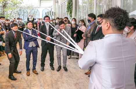 ご新郎様のご指名で“ゴムパッチンゲーム” 当たるか当たらないかドキドキのご友人様の表情も必見!「せーの!」の掛け声でゴムが勢いよく放たれ、外れの人のお顔にヒット!頑張ってくれたご友人様にはご新郎さまからプレゼントも♪