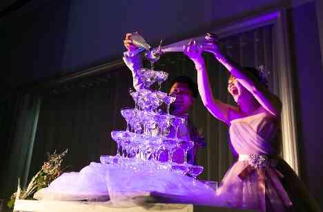 光の演出“シャンパンタワー”なんと、お腹の中にいる赤ちゃんの性別発表として取り入れました♪水を注ぐと男の子であればブルー、女の子であればピンク色に光ります☆実は…ご新郎様には当日まで性別を内緒にし、光の色で発表するというサプライズ演出にしました!演出の前はドキドキで少し緊張されていたご様子のご新郎様ですが、色が見えてくると驚きと喜びで笑顔があふれておりました♪