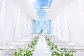 チャペルの正面から天井まで窓一面に美しい空が広がるチャペル「Ciel(シエル)」。祭壇の奥から差し込む自然光、白に統一されたデザインで、天井高7m、バージンロード11mの開放的な空間。