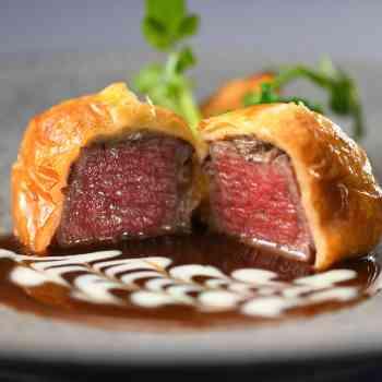 前菜:オマール海老とホタテを使用したシェフ渾身の前菜/メイン:当館スペシャリテ「黒毛和牛のパイ包み焼き」/デザート:シェフが目の前で仕上げるフランベ演出「フルーツジュビレ」※焼き立てパン5種付