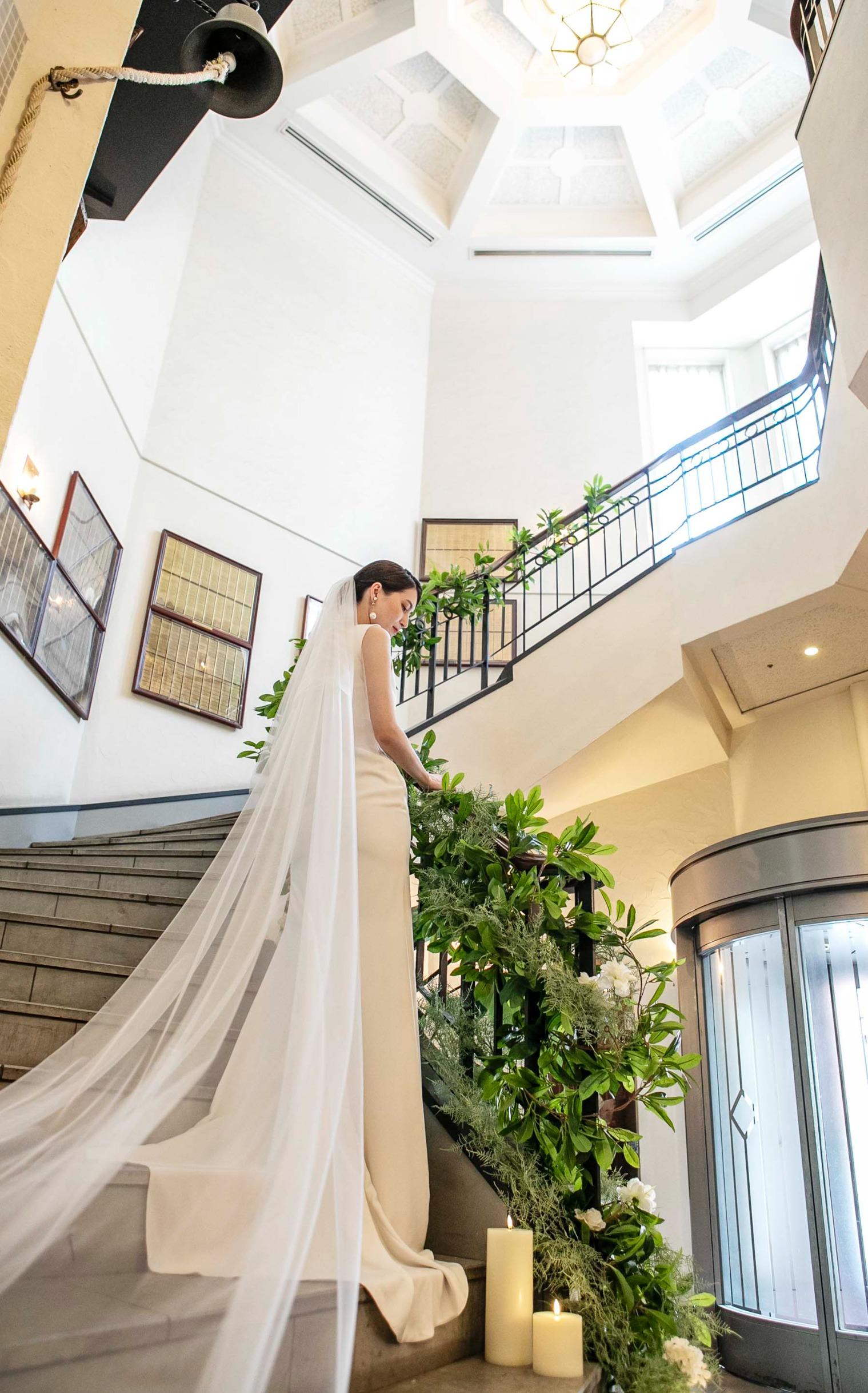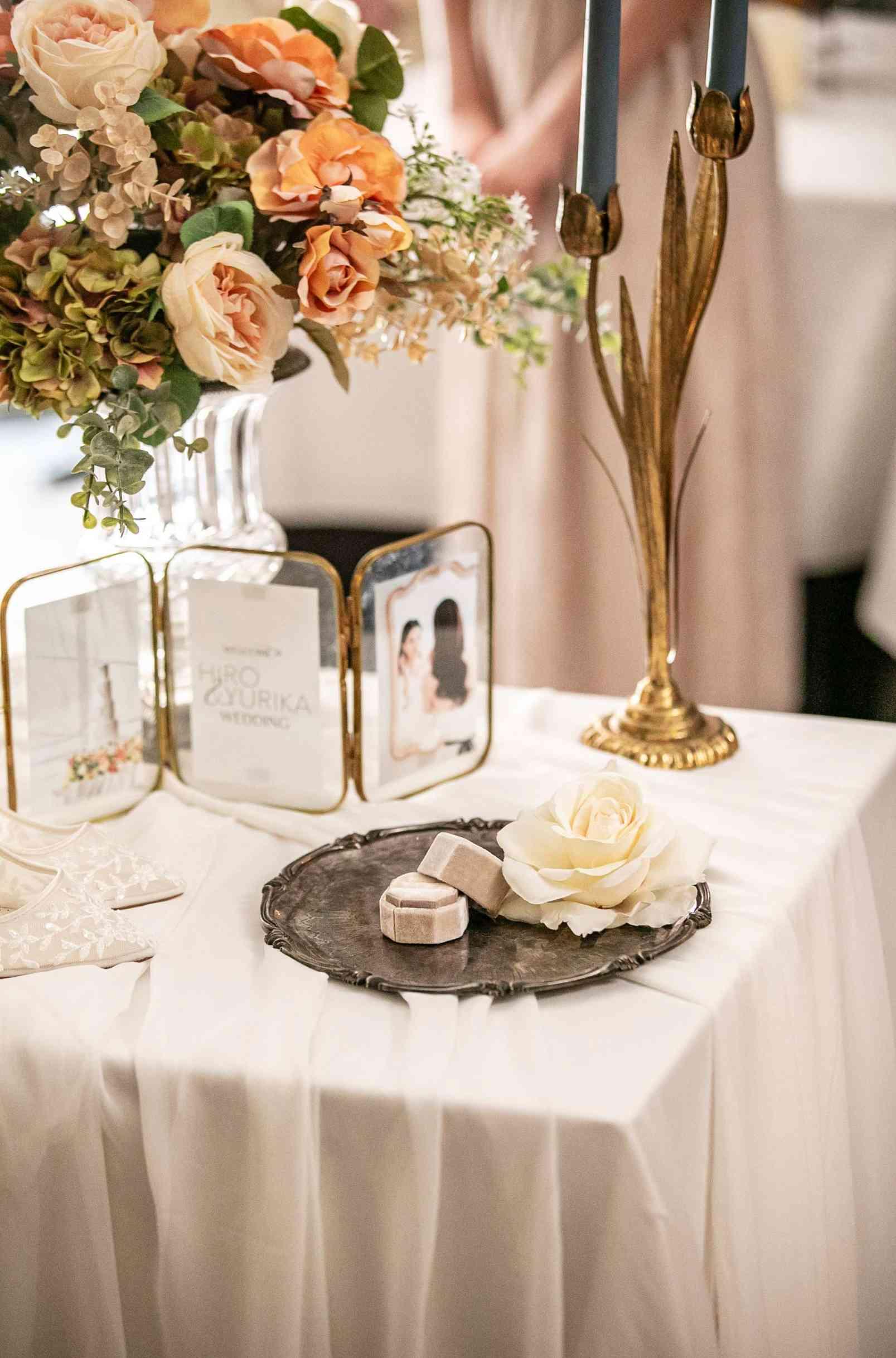 桜がモチーフのシャンデリアが優雅にきらめき、ふたりが座るメインテーブルの背にあるクリスタルカーテンがよりおふたりを輝かせます。家族や親族の方、近しいご友人様を招いてアットホームウェディングが叶います