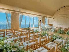 大きな窓から贅沢に降り注ぐ自然光のもとで、誓いの場に向かう花嫁の姿は感動的。「スカイチャペル」の名の通り、まるで空に浮かんでいるように見えるほど空との距離が近いチャペルです。祭壇から見える絶景を背にした撮影も人気です。