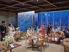 地上200mの高さから景色を一望できるパーティ会場。大きな窓から自然光が降り注ぐ開放的な空間です。感動的な景色を背に最高の1枚を残してみては。宝石を散りばめたような夜景が美しいナイトウエディングもおすすめです。