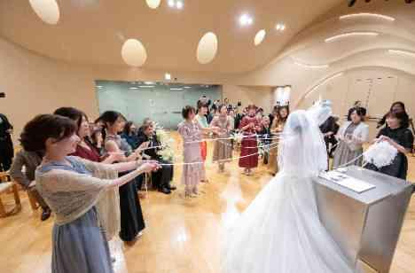 お式後は女性ゲストの皆様を集めたブーケプルズのスタートです☆ ブーケに繋がれているリボンを手にし、ご新婦様の合図を待つ皆様・・・。ドキドキの瞬間です! リボンの先にはお二人からの幸せのお裾分けが♡ お二人から幸運のプレゼントを受取ることができるブーケプルズは、結婚式の中でも人気のある演出です☆