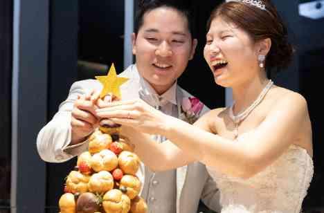 披露宴が進み、いよいよケーキ入刀のお時間! ケーキがでてくると思いきや、出てきたのはシュークリームのタワー☆ 入刀ではなくタワーの上にお二人で星形のトッパーを指してケーキを完成!! ファーストバイトはもちろんシュークリームで! ウエディングケーキにもお二人らしい演出を取り入れることで素敵な思い出の1つとなります。会場も盛り上がり、笑顔あふれる素敵な瞬間でした♡