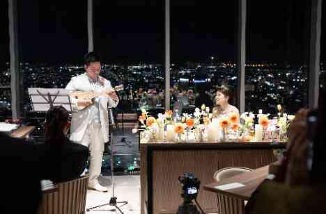 パーティはクイズゲームを開催し、大盛り上がり☆ そしてウクレレがお好きなご新郎様が皆様に感謝の気持ちを込めて演奏のプレゼントも♪ この日のためにご準備をされてきたご新郎様。 皆様も演奏に耳を傾けます。ウクレレの優しい音色に会場全体が癒しの空間へと変わりました。 ゲストの方との時間を大切にしたいというお二人の想いが素敵なパーティ時間をつくり上げました。