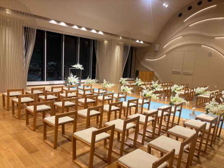 チャペルがドーム型で音の反響がよく、木目調のデザインがグッド。控室から直結してるのも良い。当然、眺めもバッチリ。