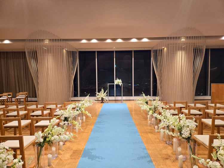 素晴らしい眺望を前提に露宴会場の色使いや大きな窓ガラス、段を設けて景色が見やすい工夫がされていた点がよかった。