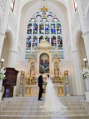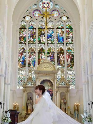 ノートルダム広島のステンドグラスはミュージアムグラスと呼ばれる透明度の高いものを使用。おふたりを包み込む柔らかい日差しが挙式をあたたかな空気に彩る。