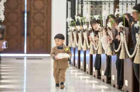 ファミリーミートで挙式前にご家族様にも想いをしっかりお伝えされたおふたり。いよいよゲストの皆様にも見守られての結婚式では少し緊張されたご様子。そんな時に可愛らしいリングボーイくんの登場で大聖堂内は一気に温かい雰囲気に。長いヴァージンロードを一歩一歩と歩いてくるお姿におふたりもたまらず笑顔に。おふたりの元へと頼もしく歩む姿にゲストの皆様もカメラを構えておられました。