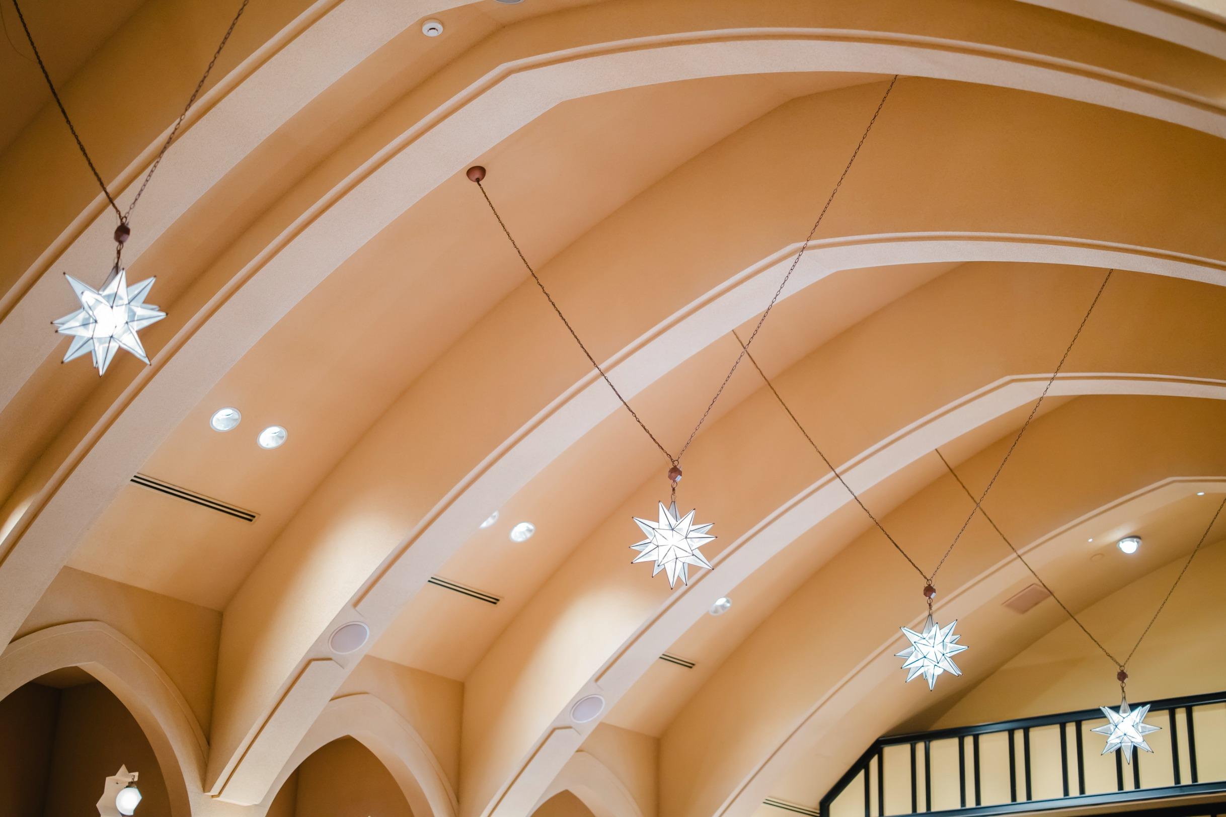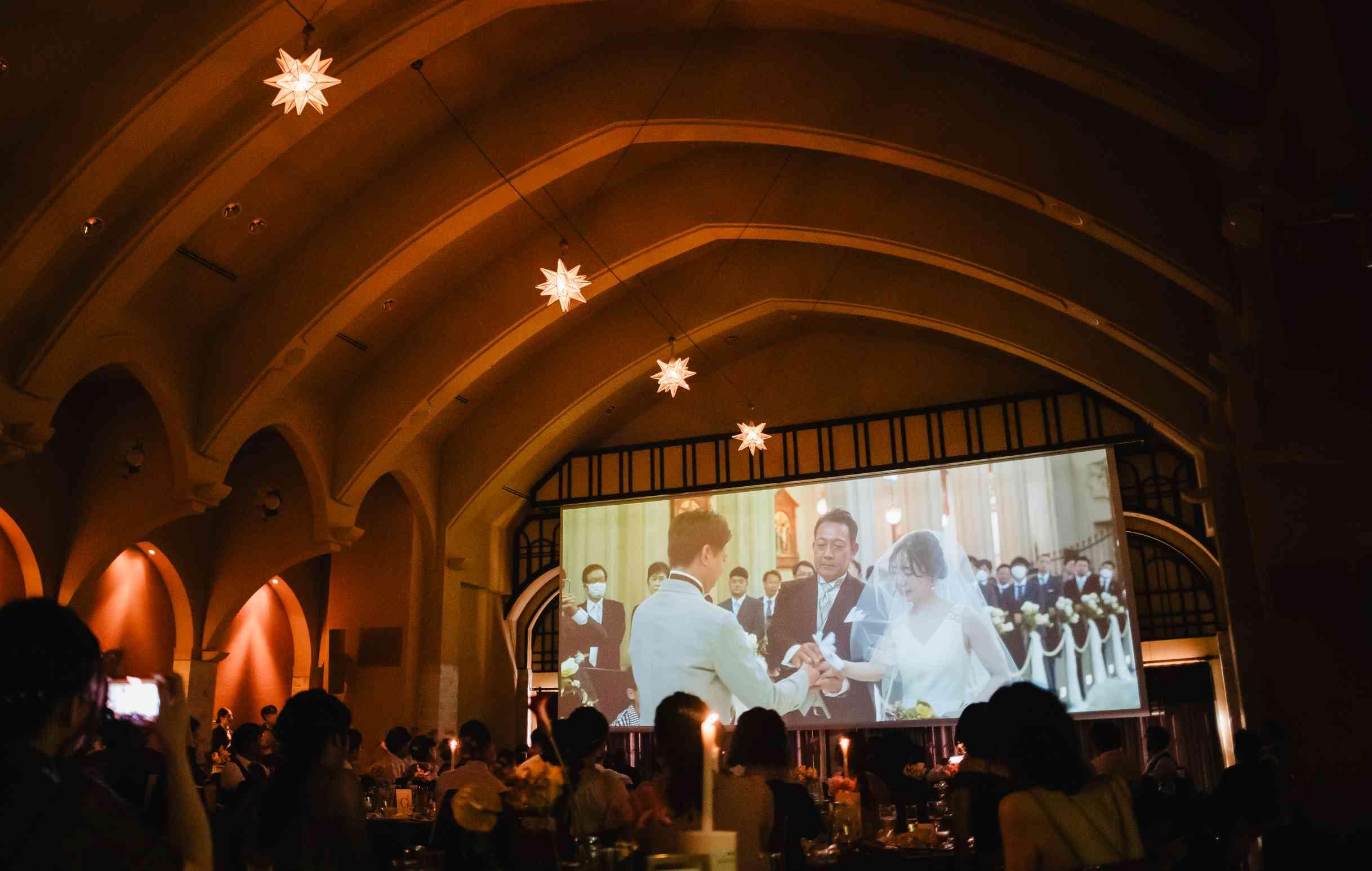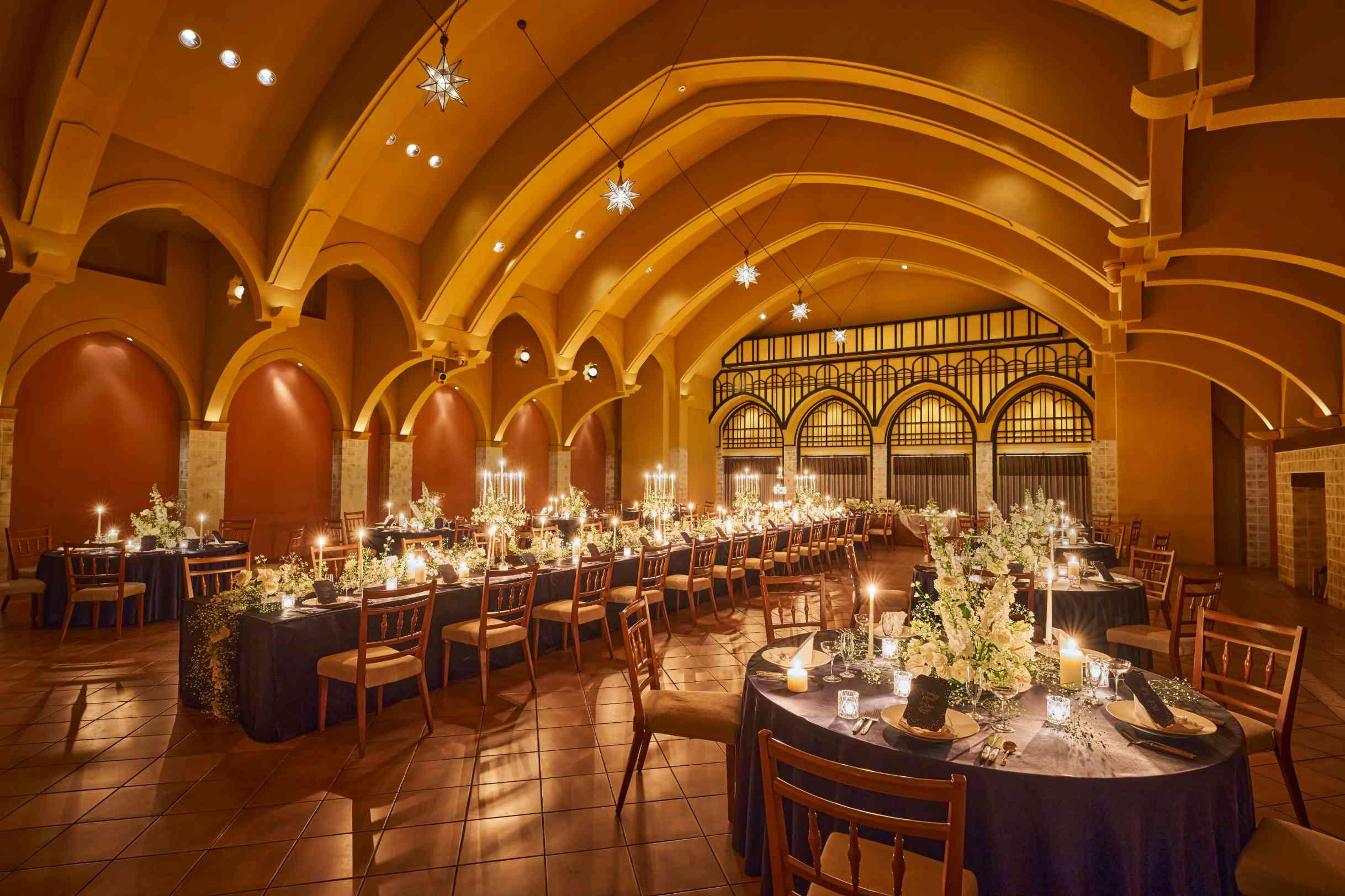広大な敷地で世界観たっぷりのテーマパークに佇む憧れ大聖堂。天井高20m、バージンロード22mの壮大な空間でステンドグラスの輝きに包まれて。ゲストも満足の感動ウエディングをお約束(2~120名収容可)