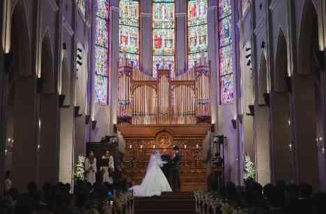 ゲストの皆様に感謝の想いを伝えたい!と受付時にスイッチングレターをご用意されたおふたり 挙式会場内で一斉に読んでいただき涙を流すゲストの方も 会場内が暖かい空気に包まれる中おふたりが入場 25mの長いバージンロードを1歩ずつ踏みしめながら歩くお姿 そしてステンドグラスに包まれながら祭壇上で愛を誓うおふたりのお姿はゲストの皆様の記憶に刻まれる感動的なお時間となりました