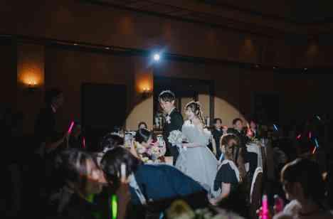 おふたりはゲスト全員が楽しめる演出としてカラードレスの色当てクイズを行いました 受付時に新婦様のカラードレスの色を予想していただきサイリウムを配り お色直し入場時にサイリウムを降っていただくことでライブ会場のような華やかさのある入場となりました 新婦様のお好きなキャラクターを知っているゲストの方はピンク色をお持ちの方が多数でしたが まさかのパステルブルーで登場!会場は大盛り上がりでした