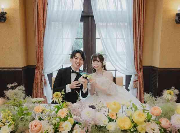 おふたりはゲストの皆様にゆったりと楽しんでいただくため広々とした披露宴会場「プレジール」をお選びいただきました 装飾はドレスや会場の雰囲気に合わせてこだわりのお花で彩り一体感のある素敵な会場となりました 演出ではケーキ"入刀"ではなく ケーキ"ドリップ"でご披露 おふたりでソースをかけて素敵なケーキを完成させる演出はゲストの方の印象にも残るおふたりらしい演出でした