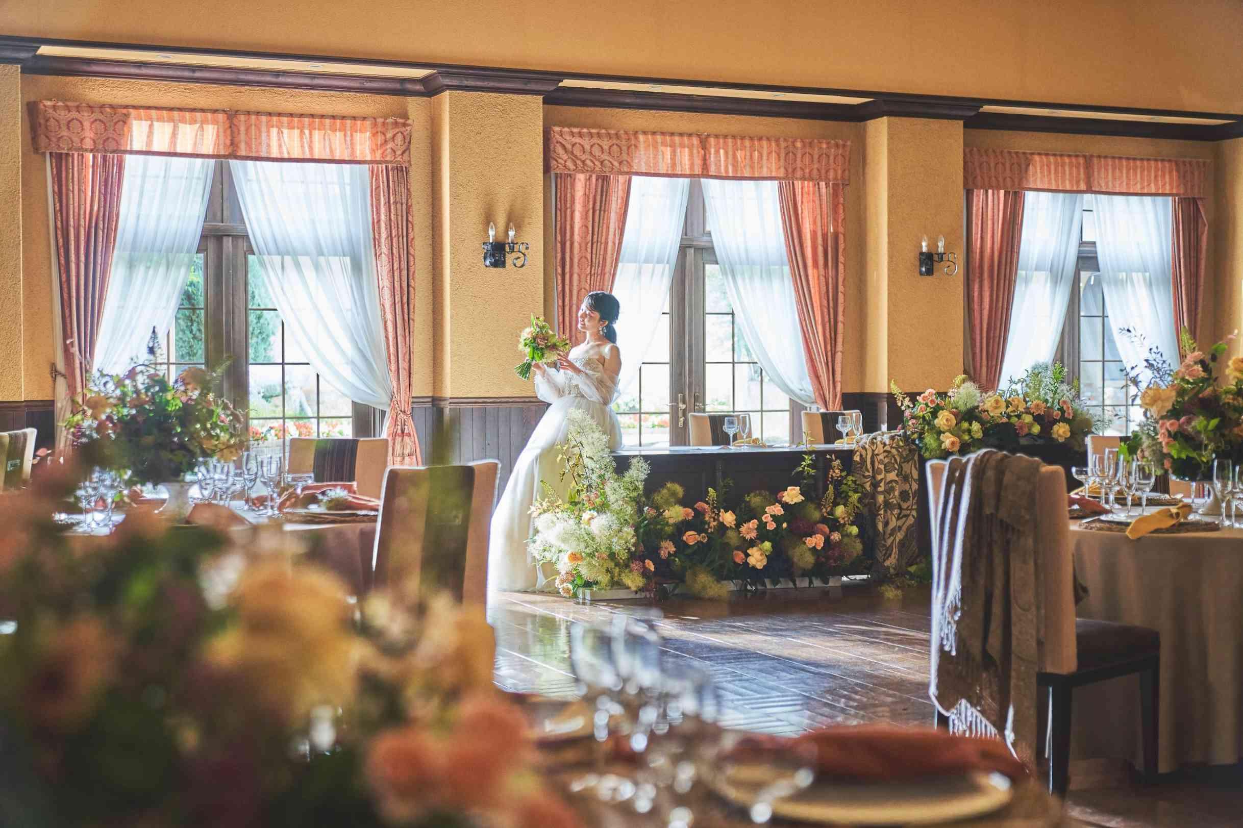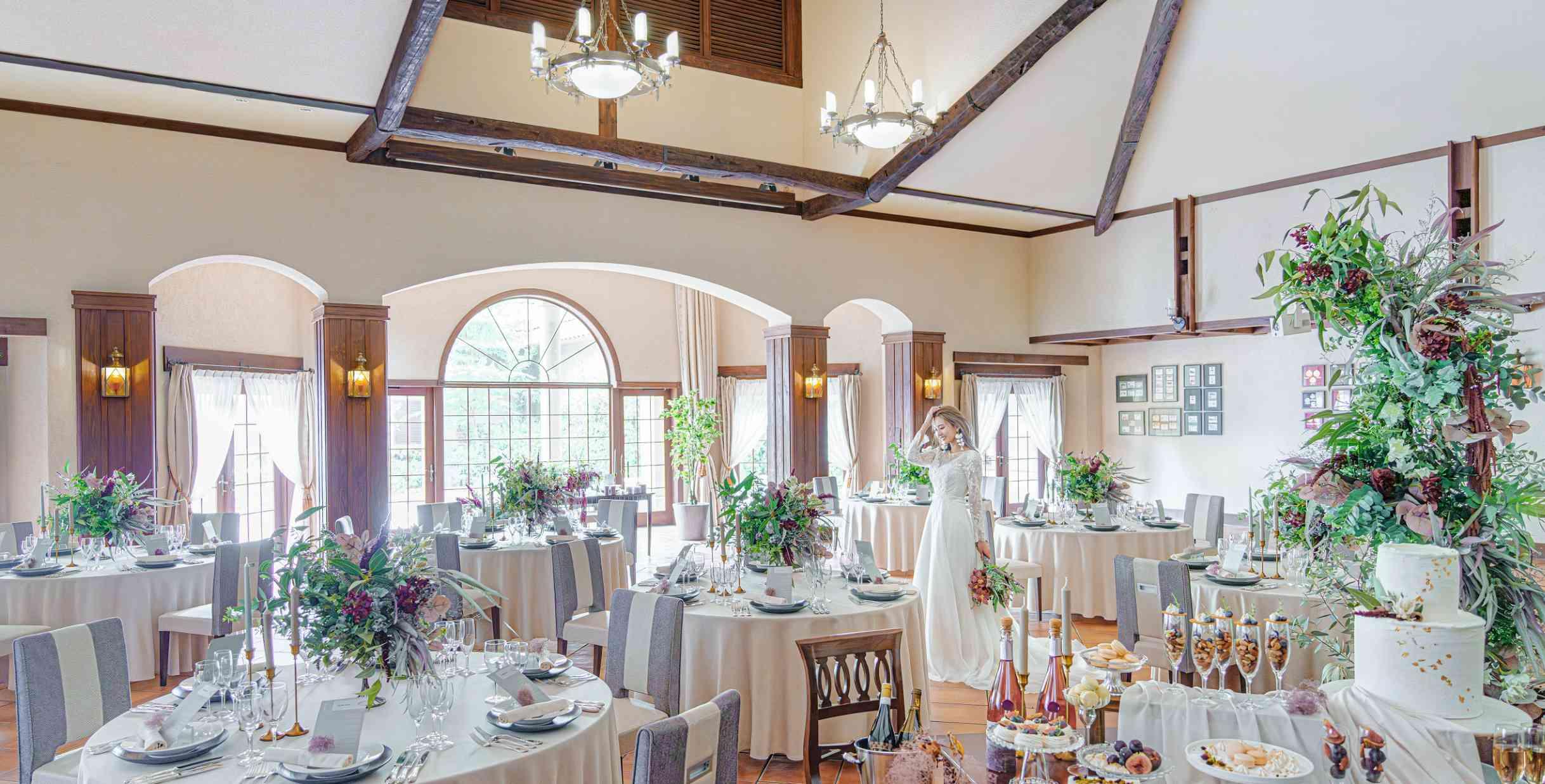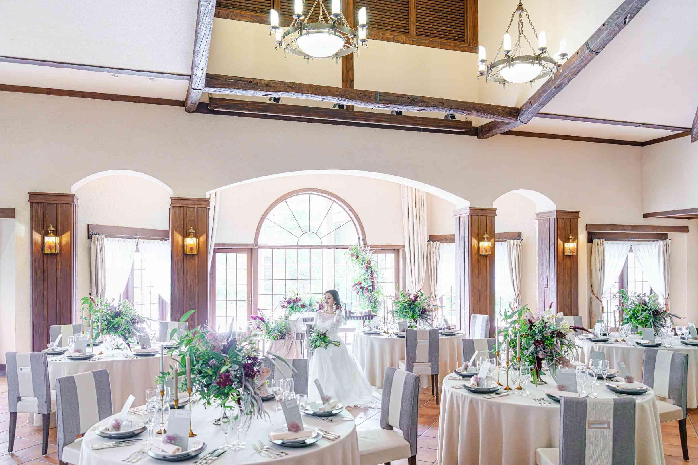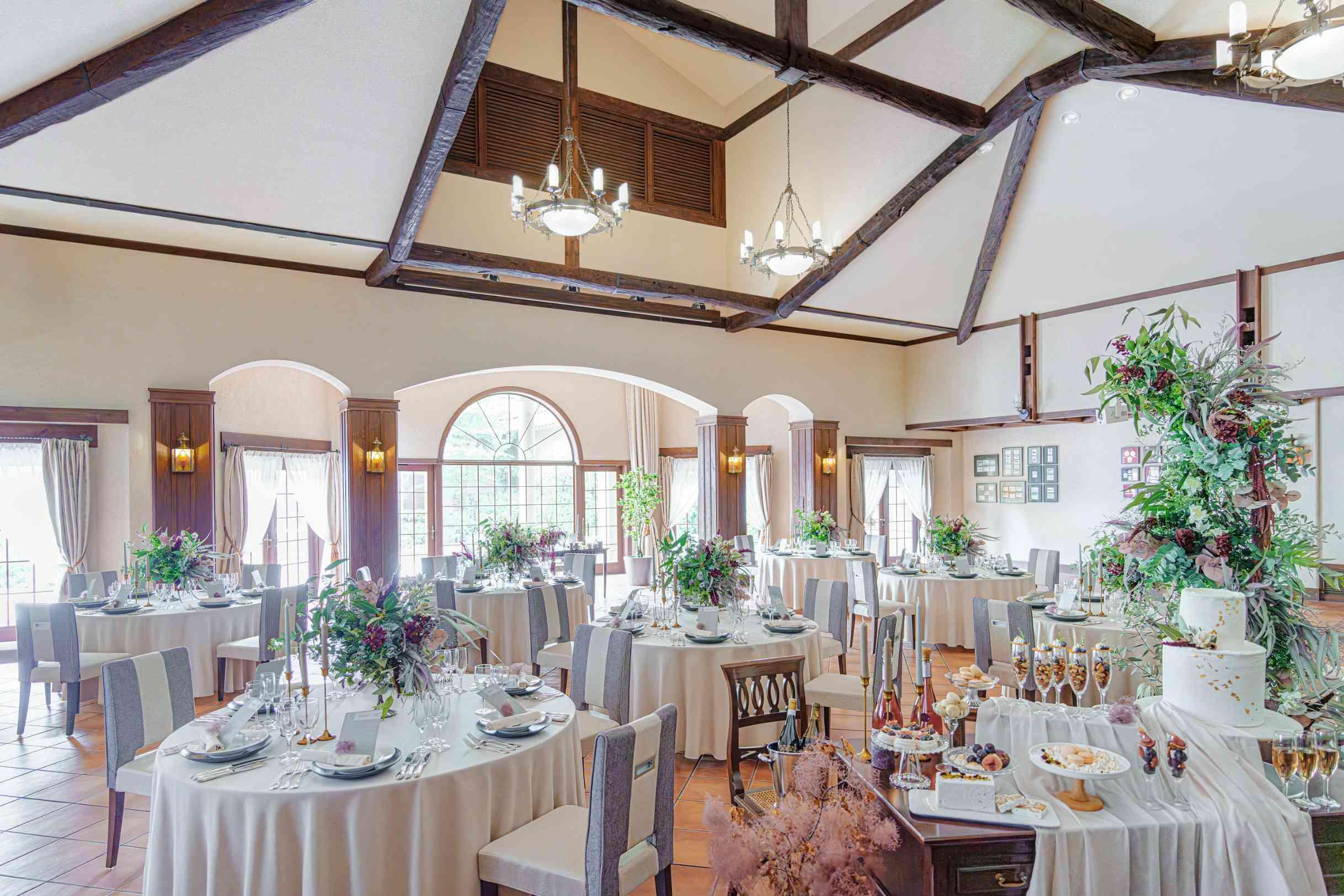 ヨーロッパの雰囲気が漂うプライベートガーデン付きの披露宴会場。ナチュラルテイスト、レンガ調テイスト、ゴージャステイスト、様々なテーマに基づいた会場からおふたりの好みで選んでいただけます。