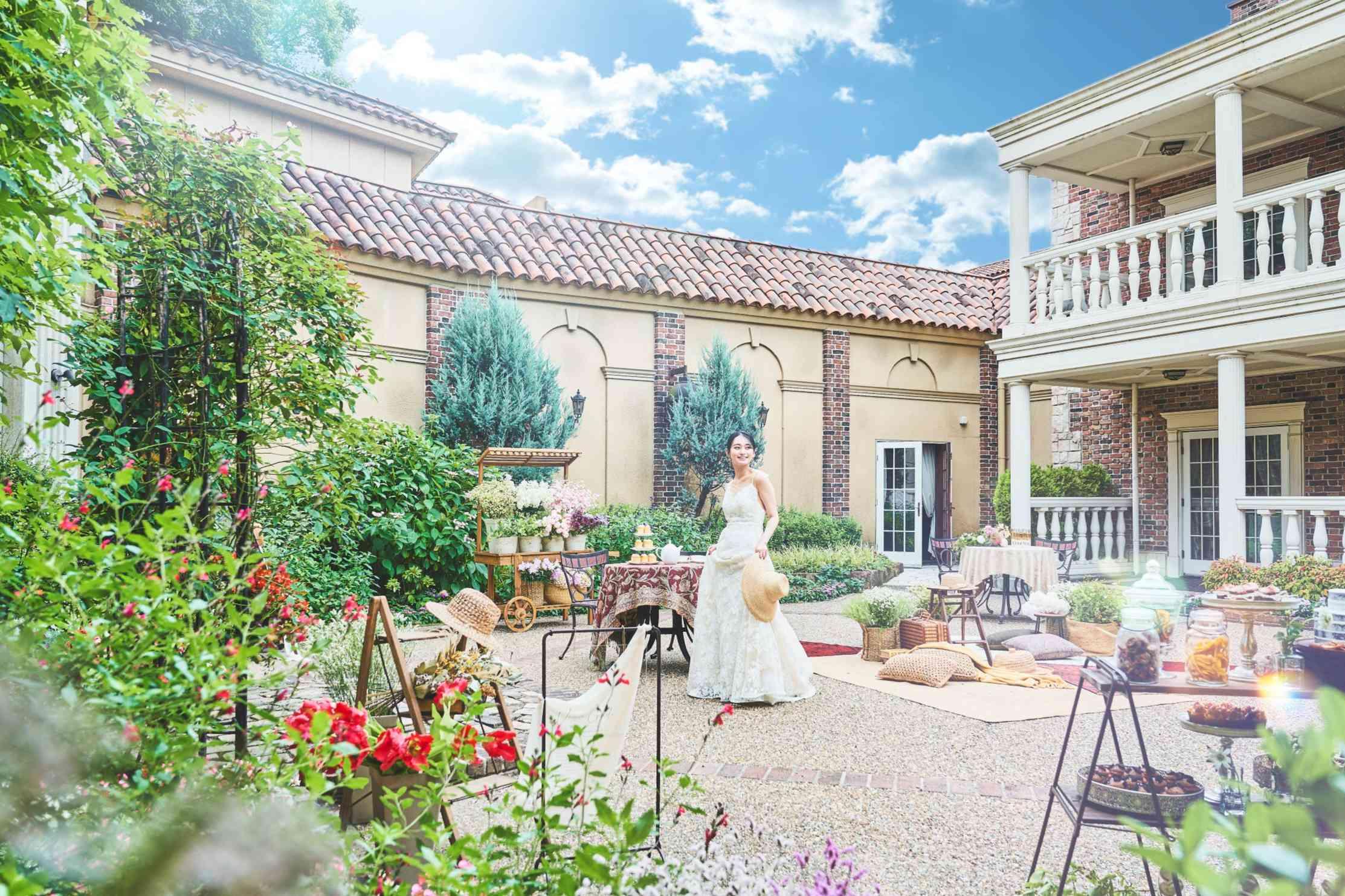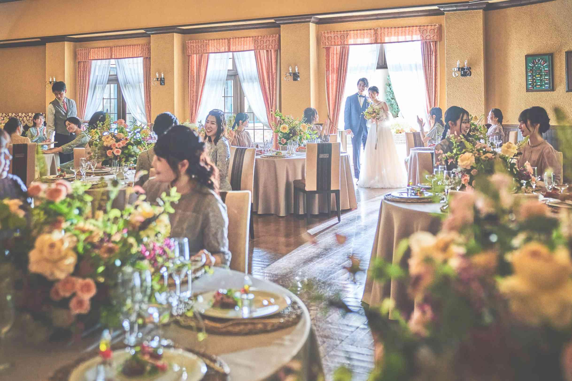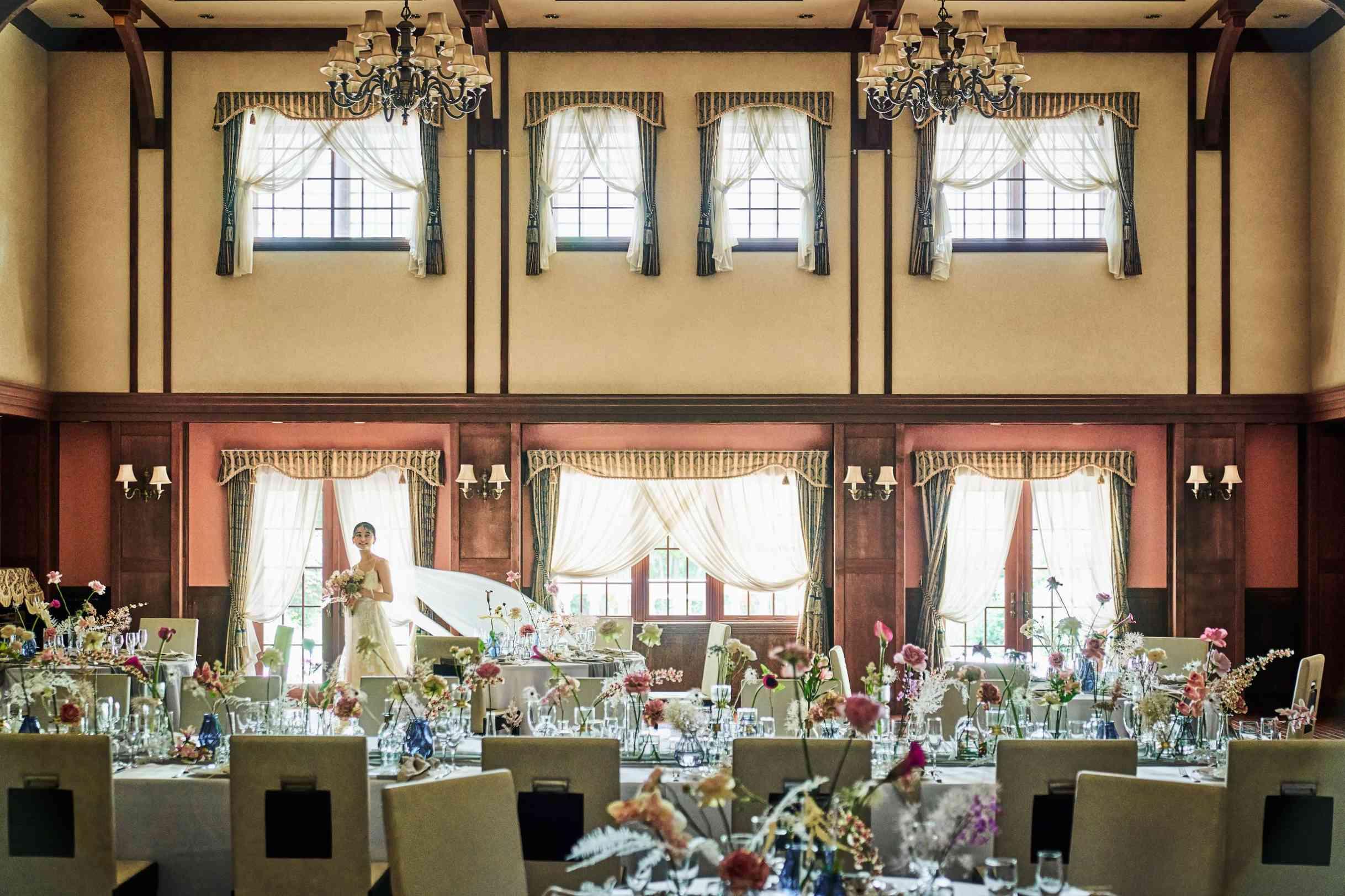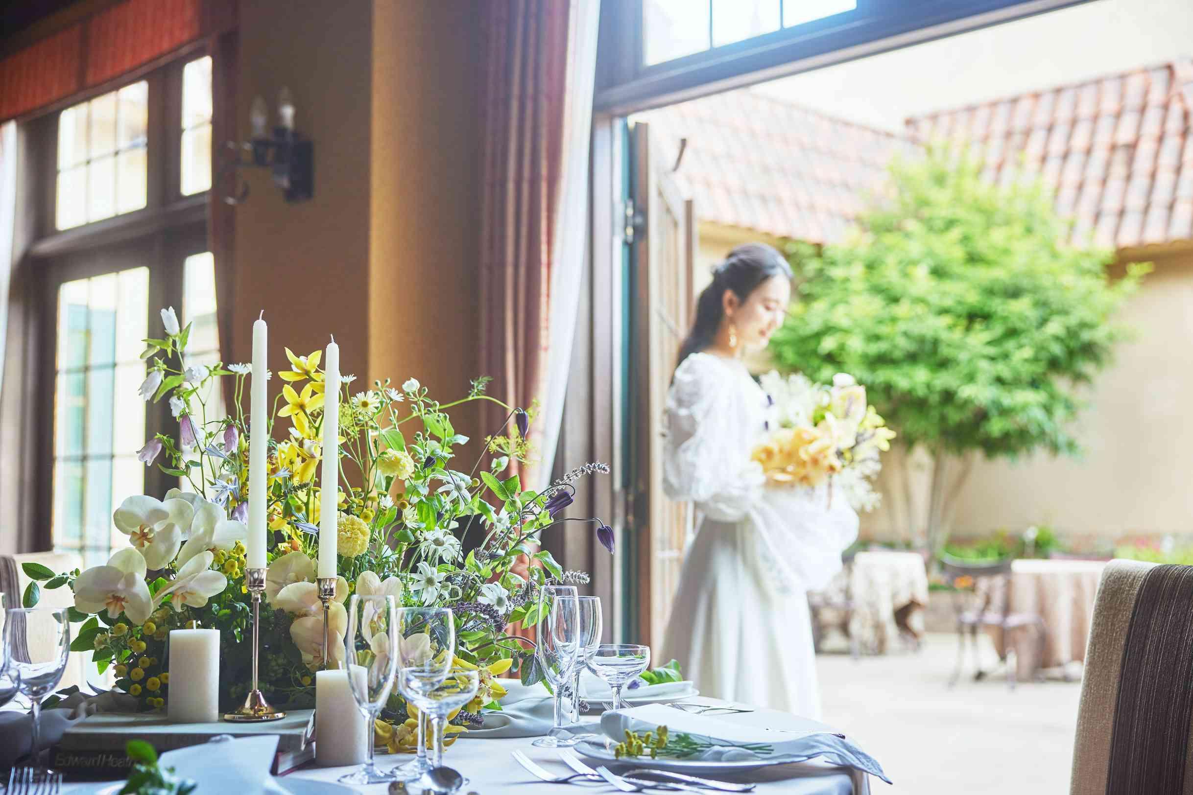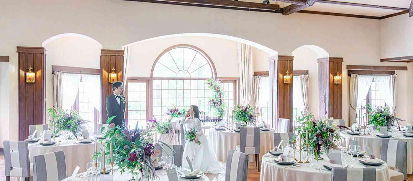 ヨーロッパの雰囲気が漂うプライベートガーデン付きの披露宴会場。ナチュラルテイスト、レンガ調テイスト、ゴージャステイスト、様々なテーマに基づいた会場からおふたりの好みで選んでいただけます。