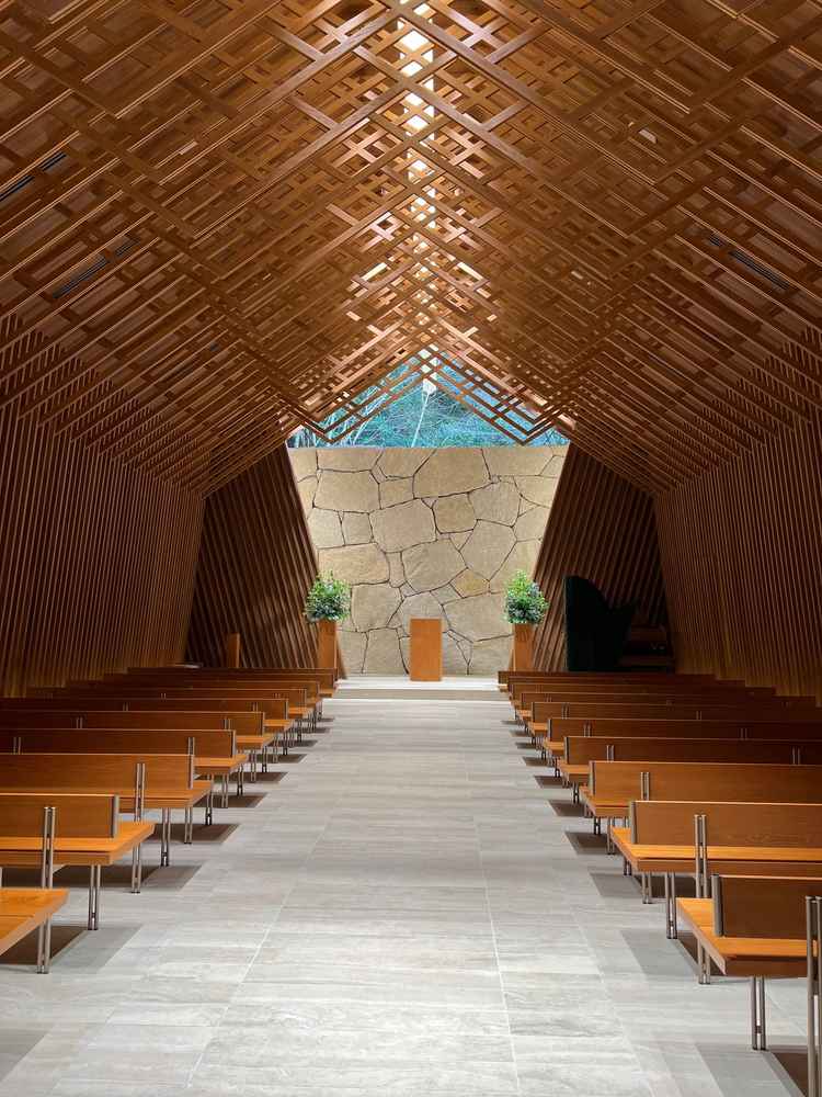 挙式会場は洗練された雰囲気でとても素敵でした。今まで見た式場で一番素敵だと思いました。少し外の葉が見えるのも風情を感じました。