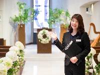 ブルーのステンドグラスが印象的なアーチ状のホール型チャペル。生演奏の響きは圧巻!