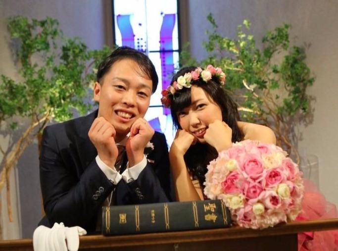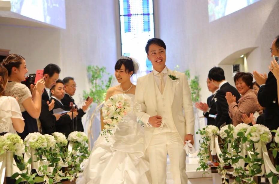 「後方席の参列者にも見やすいように」と正面のカメラからチャペル壁面にライブ中継をする演出をセレクト。緊張しているふたりに牧師が場内を和ませるトークで終始参列者も笑顔になりました。