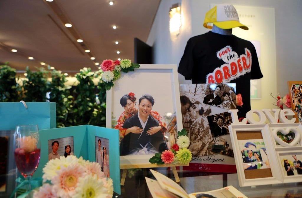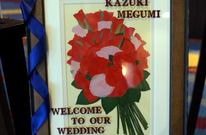 結婚式前夜まで準備したというウエルカムスペースは、ふたりが出会った大学時代の思い出のアイテムや写真、プロポーズされた日に新郎からもらった花束を押し花にしたウエルカムボードなど、ゲストも楽しめる内容になりました。