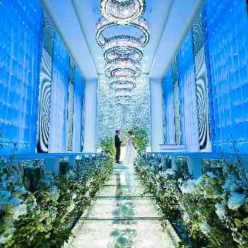 色が変化する演出を楽しめる700個のキャンドルの灯りや、天井に輝くシャンデリア、クリスタルを敷き詰めた『ガラスのバージンロード』、天使の羽が降りそそぐ演出など、唯一無二の世界観で花嫁を美しく魅せる。