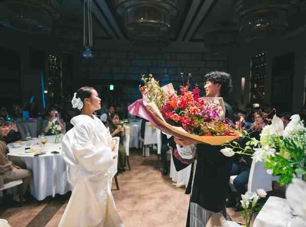みんなでワイワイ過ごすことをテーマにしました。 入場では、ロースモークや巨大クラッカーを使ってゲストへサプライズ演出をしたり お色直しでは和装を着て入場しました♪ 和装で鏡開きをしたりと演出も盛りだくさんにしました! ゲストの方にも楽しんでいただきたかったので、ゲスト参加型の演出も入れたり 終始ワイワイしていたと思います。
