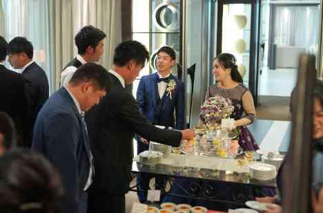 披露宴後半には、皆様に楽しんでいただけるおもてなし演出として、デザートビュッフェとつけ麺ビュッフェをご用意されました。実はこの“つけ麺”、おふたりの大好物。おふたりらしいユーモアとこだわりが詰まったビュッフェスタイルは、ゲストの方々にも大好評で、あちらこちらに笑顔の輪が広がっていました。甘いものが好きな方も、しょっぱいものが好きな方も満足できる、楽しくておいしいひとときとなりました。