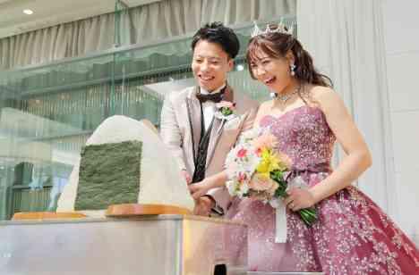 演出の中でも特に印象的だったのが、新郎様のご実家がお米屋さんというご縁から生まれた“BIGおにぎり入刀”。ユニークで心温まる演出に、ゲストからは驚きと笑顔がこぼれました。さらに、おもてなしの締めくくりには、コース料理の最後に一口サイズのおにぎりをご提供。おふたりらしいアイデアが詰まった演出に、ゲストの皆様からも「美味しかった」「ほっこりした」と好評でした。