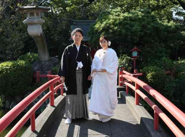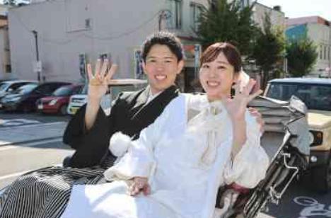 おふたりの結婚式の一日は、伝統的な和装姿で人力車に乗って三嶋大社へ向かうところから始まりました。秋のやわらかな光が差し込むなか、人力車のゆるやかなリズムに乗って三島の街を進むおふたり。道行く人々や観光客からの「おめでとう!」の声も飛び交い、華やかなひとときに。 いつもの街が特別な景色に変わる、感動的なスタートでした。