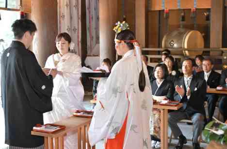 挙式は、由緒ある三嶋大社での厳かな神前式。澄んだ秋空のもと、凛とした空気が漂う本殿にて、家族とご友人に見守られながら夫婦の誓いを交わされました。 雅楽の音色が響くなか、おふたりの晴れ姿はまさに日本の美。ご友人たちは、本殿の外からその様子を静かに見守り、ふたりの門出を心から祝福されていました。伝統と絆を感じる、心に残る瞬間となりました。