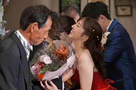 披露宴のクライマックスは、親御さまへの記念品贈呈のシーン。育ててくれた感謝の想いを込めて、おふたりから花束が手渡されました。 新婦様が満面の笑みで親御様にハグを交わす姿からは、これまでの感謝の気持ちと、これからも続く親子の絆が伝わってきます。 あたたかな空気に包まれたこの瞬間、会場全体が感動に包まれ、ゲストの皆様の目にも自然と涙が浮かんでいました。