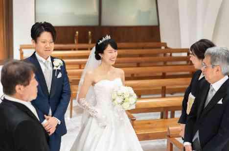 挙式直前、チャペルで行われたのは、“ファミリーミート”。扉が静かに開き、そっとご両親に近づき、新郎新婦が「トントン」と肩に手を置くと、ご両親が振り向きます。そこには、タキシードとドレスに身を包んだ晴れ姿のおふたり。その瞬間、ご両親の表情が一変し、驚きと感動が入り混じったような優しい笑顔に。これまでの想い出が一瞬でよみがえり、新たな家族のつながりを実感できる、心あたたまる時間となりました。