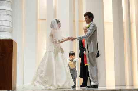 新郎Kokiさんは、お父様からジャケットを羽織らせてもらう「ジャケットセレモニー」で登場。 新婦Miwaさんは、お母様からのベールダウンを受け、お父様とともにバージンロードを歩まれました。以前から「娘と一緒に歩きたい」と願っていたお父様にとって、その想いが叶う瞬間はかけがえのないものに。 さらに、おふたりのお子様Rikuくんも一緒に参加し、ご家族三人で迎える温かさに満ちた挙式となりました。