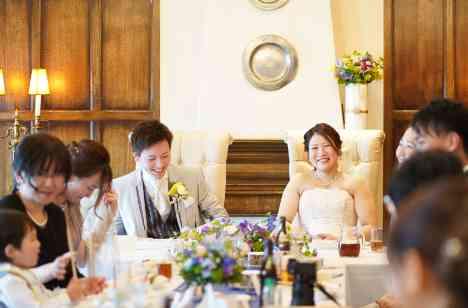 披露宴はライラックルームで。大切なゲストをお迎えし、和やかな雰囲気のなかでゆったりとお食事を楽しむ会食スタイルでした。 おふたりの自然な笑顔やゲストとの会話が一層引き立ちます。 ケーキ入刀のシーンでは、会場が一気に盛り上がり、祝福の拍手が響き渡りました。 形式ばらず、リラックスした雰囲気の中で進む披露宴は、まさにおふたりらしさが溢れる時間となりました。