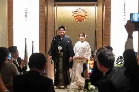 披露宴は、自然光が降り注ぐ会場「フレイア」でスタート。 新婦Shokoさんは挙式と同じ白無垢姿でご入場され、伝統美あふれる装いに会場から大きな拍手が起こりました。 おふたりの凛とした立ち姿に、ゲストの皆様も感動の表情に。 和の美しさとおふたりの人柄が調和した、心あたたまる披露宴の始まりとなりました。