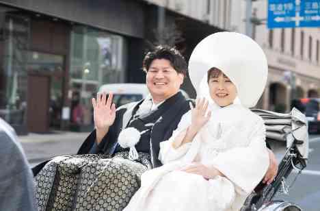 ホテルを出発し、人力車に乗って三嶋大社へと向かわれたおふたり。 白無垢姿の新婦Shokoさんと紋付袴の新郎Kaiさんが並ぶ姿は、まるで映画のワンシーンのようでした。 晴れやかな笑顔で手を振るおふたりに、通りすがる人々からも祝福の拍手が送られ、温かな空気に包まれた道中に。 三島のまち全体が祝福しているかのような、心温まる時間となりました。