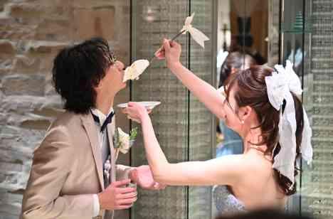 披露宴は、乾杯とともに温かな拍手と笑顔が広がりスタート。 ゲストが次々とおふたりの席まで訪れ、直接お祝いの言葉を交わすアットホームな雰囲気に包まれました。 お色直しは、爽やかなブルーのドレス。 ケーキ入刀のあとはビッグスプーンでのファーストバイト!会場中が笑顔に包まれる楽しいシーンとなりました。 デザートビュッフェではおふたり自らがゲストへおもてなしをしながら、感謝の気持ちを伝えました。