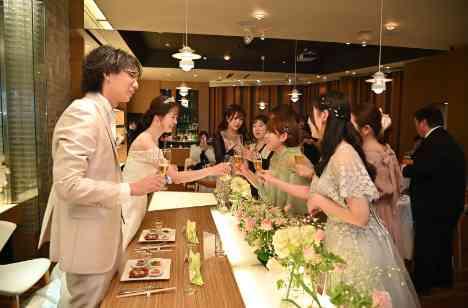 披露宴は、乾杯とともに温かな拍手と笑顔が広がりスタート。 ゲストが次々とおふたりの席まで訪れ、直接お祝いの言葉を交わすアットホームな雰囲気に包まれました。 お色直しは、爽やかなブルーのドレス。 ケーキ入刀のあとはビッグスプーンでのファーストバイト!会場中が笑顔に包まれる楽しいシーンとなりました。 デザートビュッフェではおふたり自らがゲストへおもてなしをしながら、感謝の気持ちを伝えました。