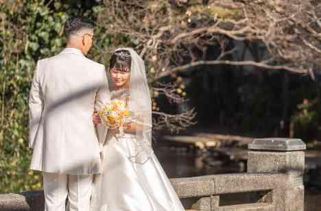 前撮りは、三島を代表する人気スポット「源兵衛川」にて。 澄んだ水のせせらぎと緑がきらめくロケーションで、ウェディングドレス姿のおふたりが自然と笑顔に。 川沿いをゆっくりと歩きながら撮影を楽しまれ、まるで映画のワンシーンのような写真が完成しました。 ナチュラルで柔らかな雰囲気が、おふたりらしさをそのまま表した素敵な時間となりました。