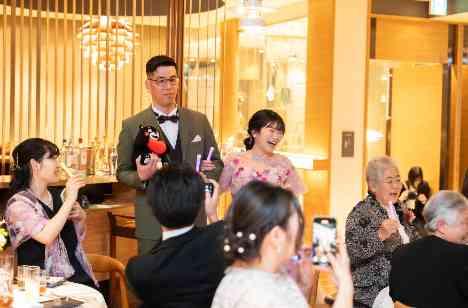最初の入場は色鮮やかな色打掛姿で、ガーデンから登場! 乾杯直後にはフレアバーテンディングの演出があり、できあがったカクテルはご友人にプレゼントしました。 再入場では、受付で行った「再入場BGM当てクイズ」の答えがついに発表! ピンクのカラードレスで登場したおふたりに、会場は大盛り上がり。 正解発表の瞬間には歓声と笑顔があふれ、楽しい一体感に包まれた時間となりました。