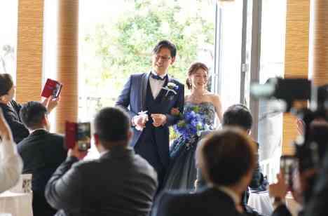 披露宴は、ゲストとの距離が近く、終始笑顔のあふれる和やかな雰囲気に。 会話や写真撮影をゆっくり楽しめる時間が多く、おふたりとゲストが自然と集まり、あたたかな輪が広がっていきました。 ケーキ入刀のシーンでは、会場が一体となり、祝福の拍手に包まれます。 形式ばりすぎず、それでいて大切な節目はしっかりと。 おふたりらしいバランス感覚が光る披露宴となりました。