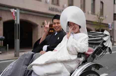 挙式当日、Yutaさん・Mutsumiさんが選ばれたのは、 人力車で 三嶋大社 へ向かうという、和婚ならではの移動スタイル。 春のやわらかな風を感じながら、ゆっくりと進む時間は、 これから始まる一日への期待を高めてくれる、大切なプロローグとなりました。 沿道からの「おめでとう」という声や視線も自然と集まり、 結婚式が“特別な一日”であることを実感できる、印象的なシーンです。
