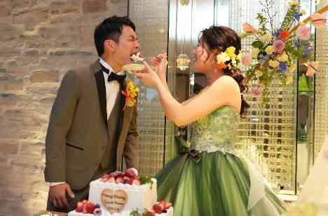 披露宴のはじまりは、綿帽子を外した白無垢姿でのご入場。 挙式の厳かさをそのままに、会場にはあたたかな拍手が広がりました。 その後のお色直しでは、グリーンのドレスに身を包み、ガーデンから再入場。自然光と緑に映える装いが、空間の雰囲気を一変させ、 和から洋へと移り変わる演出が、披露宴にメリハリをもたらします。 ケーキ入刀やファーストバイトでは、おふたりらしい自然体の笑顔があふれるひとときに。