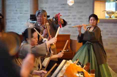 披露宴後半は、しゃぎりの余興で会場が一体に。 新婦Mutsumiさんも参加され、 音に合わせて生まれるリズムと歓声が、自然とゲストの心をつないでいきます。 地域の伝統を取り入れた演出は、 おふたりのルーツや想いが伝わるだけでなく、 ゲスト全員が参加して楽しめる時間となりました。 伝統と笑顔が重なり合い、この日ならではの余韻を残して、 披露宴はあたたかな締めくくりを迎えました。