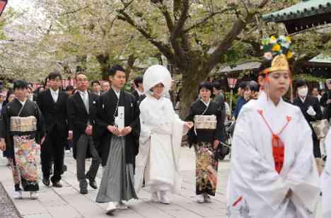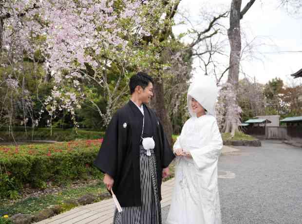 白無垢に綿帽子という、日本の伝統美を感じる装いで臨まれた三嶋大社での神前式。 春の境内には桜が咲き誇り、厳かな空気の中にも、やさしく温かな雰囲気が漂います。 神前での一つひとつの所作には意味が込められ、 家族への感謝や、これから共に歩む決意を、静かに、そして確かに伝える時間となりました。 四季を感じられるこの場所だからこそ叶う、 記憶に深く残る和の挙式です。