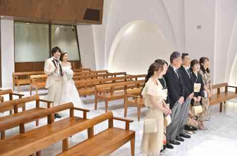 挙式は、チャペル「ソルミエ」にて執り行われました。 お母様によるベールダウンは、「幸せになってね」という想いを込めた、親から子への最後の身支度。 その後、新婦Moeさんとお母様が交わしたハグは、これまでの感謝と愛情が詰まった、胸を打つシーンでした。 ご家族に見守られながら歩くバージンロードは、これから始まる新しい人生への確かな一歩。 厳かさの中にも温もりを感じる、挙式となりました。