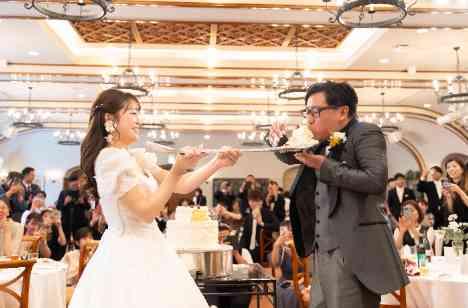 披露宴会場「プロヴァンスの九月」では、 メインソファを中心に、ゲストとの距離が近い空間が広がります。 オリジナルケーキへの入刀や、 ビックスプーンでのファーストバイトでは、 会場中が歓声と笑顔に包まれ、大きな盛り上がりを見せました。 再入場後のガチャガチャ演出から腕相撲大会へと続くサプライズ展開に、ゲストも思わず参加したくなる一体感が生まれ、終始笑い声のたえない披露宴となりました。